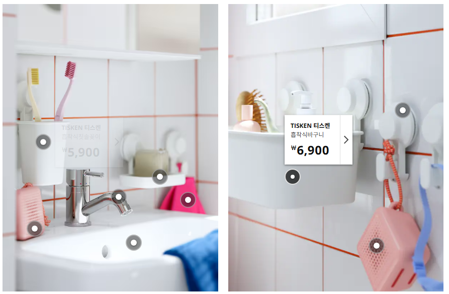 욕실에서는 ‘TISKEN 시리즈’가 많이 판매되고 있어요. 벽에 못질 필요 없이 붙였다 뗐다 하며 자유롭게 사용할 수 있습니다.