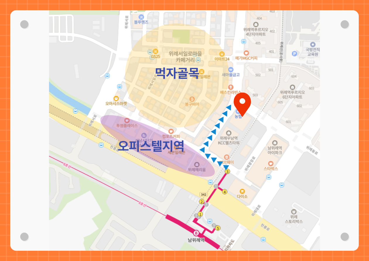 남위례역 초역세권 5분거리에 위치하고, 먹자골목과 오피스텔밀집지역 상권에 맞닿은 곳인데요. 오피스텔상권과 사무실상권 그리고 주택가와 앞에 아파트단지의 인구까지 수용할 수 있는 위치입니다.
