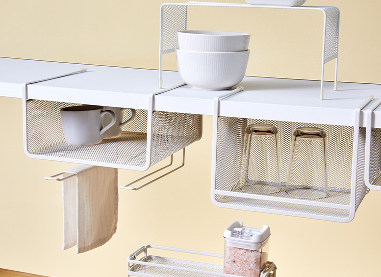 양념통, 접시, 컵 같은 자잘한 소품들을 정리하는 용도로 사용하기 좋고, 메쉬 구조라 내용물이 한눈에 보여서