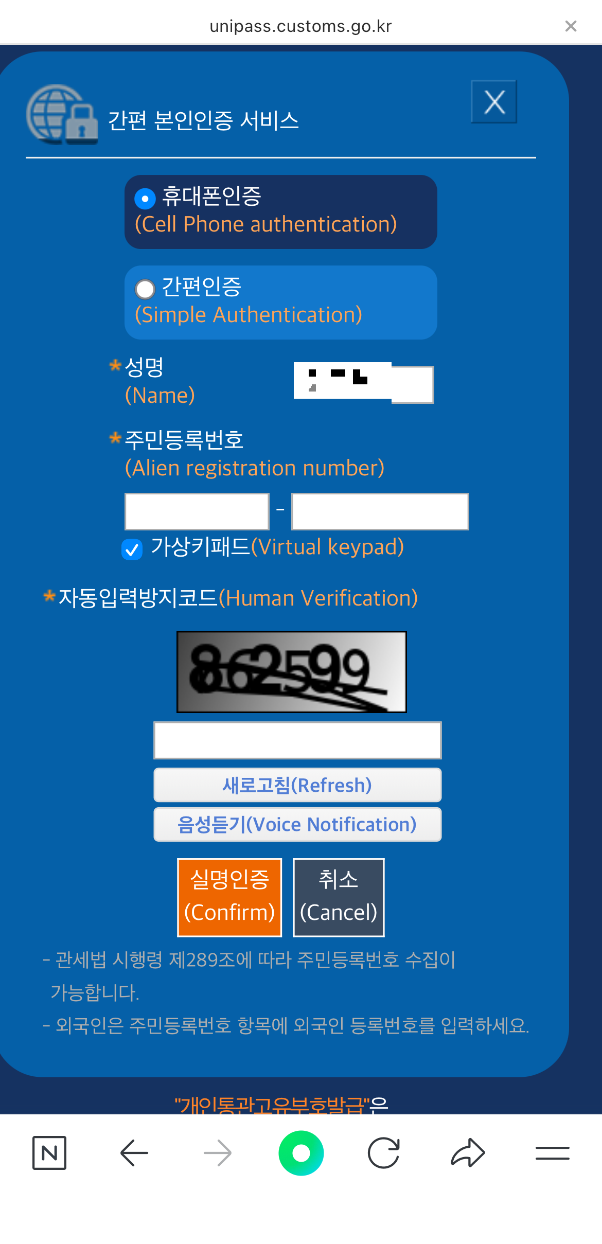 - 첫 화면에서 [개인통관고유부호] 선택
