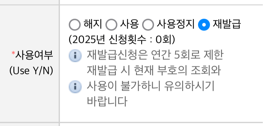 - ‘사용여부’ → 재발급 선택