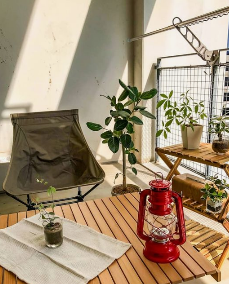 베란다에 작은 야외 테이블과 소형 그릴을 배치하여 캠핑 분위기를 더욱 즐겁게 만들 수 있습니다. 작은 공간이지만 바베큐를 즐기거나 야외에서 식사를 즐길 수 있습니다.