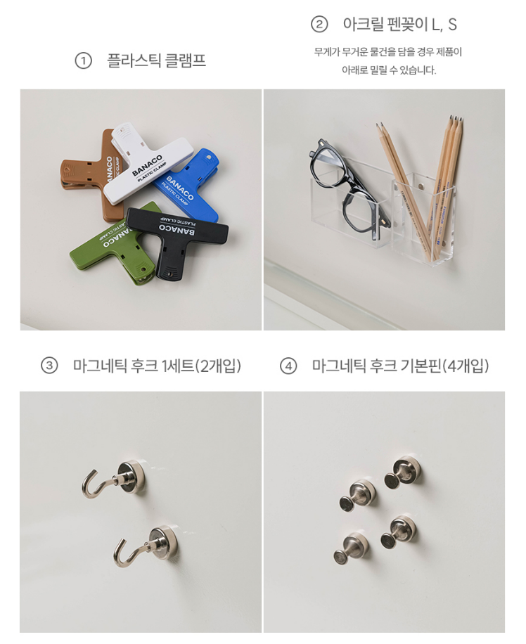포스트잇 자꾸만 떨어지는 메모지들 한눈에 보고 바로 찾아서 사용하기 편하겠죠? 마그네틱을 후크를 이용해서 집게도 걸고 포스트잇도 부착할 수 있습니다. 화이트한 크림컬러에 좋아하는 포스터까지 붙이면 자신감의 감성으로 꾸밀 수 있을 것 같아요. 아크릴 펜꽂이를 사용하여 자주쓰는 안경이나 펜도 수납하기 좋을 것 같아요.