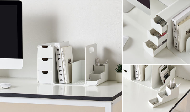 효율적으로 나누어진 책꽂이겸 수납 정리함은 자주 쓰는 물건들 찾아 꺼내서 쓰기가 편합니다. 잃어버릴것 같은 작은 소품들도 정리해서 놓으면 책상위가 더욱 깔끔해질 수 있어요.