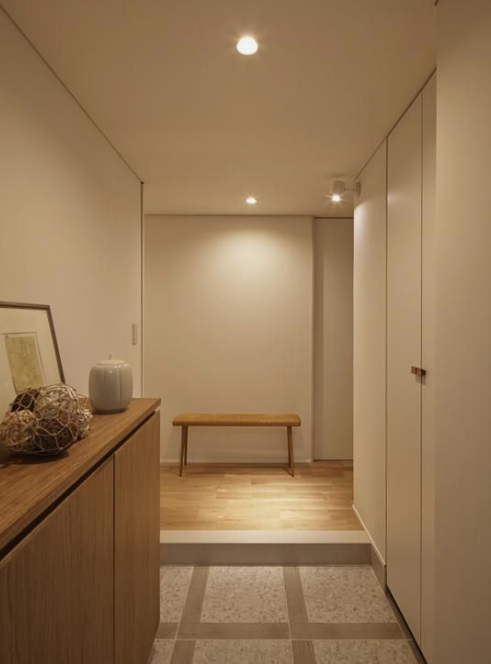 조명도 중요한 역할을 합니다. 밝은 조명은 활기찬 분위기를, 따뜻한 빛의 조명은 안락한 느낌을 줄 수 있습니다. 예를 들어, 현관에 설치된 다운라이트는 모던한 느낌을, 벽에 설치된 조명은 온화한 분위기를 연출할 수 있습니다.