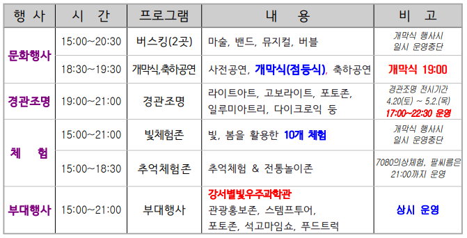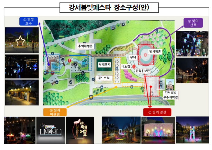 - 부대행사 : 강서별빛우주과학관 전체관측, 석고마임쇼, 스탬프투어, 관광홍보이벤트