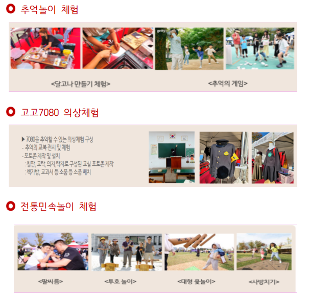 - 추억놀이체험과 전통민속놀이체험으로 나누어 운영