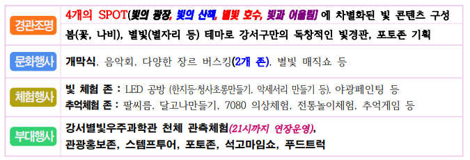 • 부대행사 : 강서별빛우주과학관 전체관측, 석고마임쇼, 스탬프투어, 관광홍보이벤트