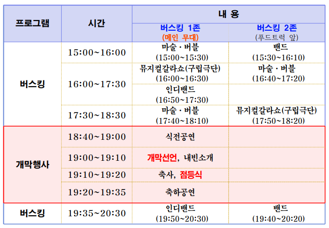 개막 전후로 마술 및 뮤지컬, 버스킹 공연들이 많이 준비되어있습니다. 출연진은 정확히 알진 못하지만 축제엔 또 밴드가 빠질수 없죠? 연인들은 음악도 들으시면서 푸드트럭에 음식과 맥주한잔도 좋은 시간이 될 것 같습니다.