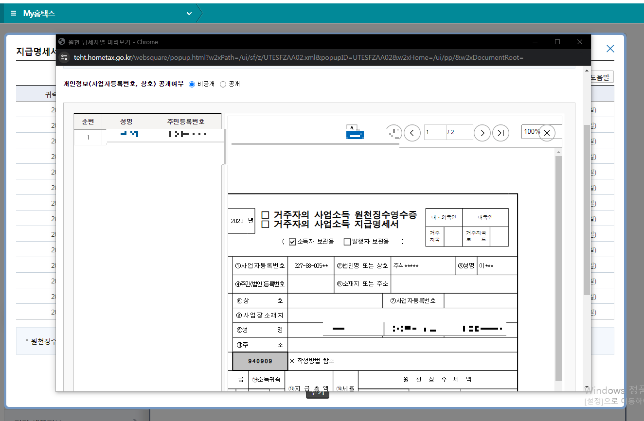 5. 확인해보고 원천징수영수증을 출력하시면 끝!