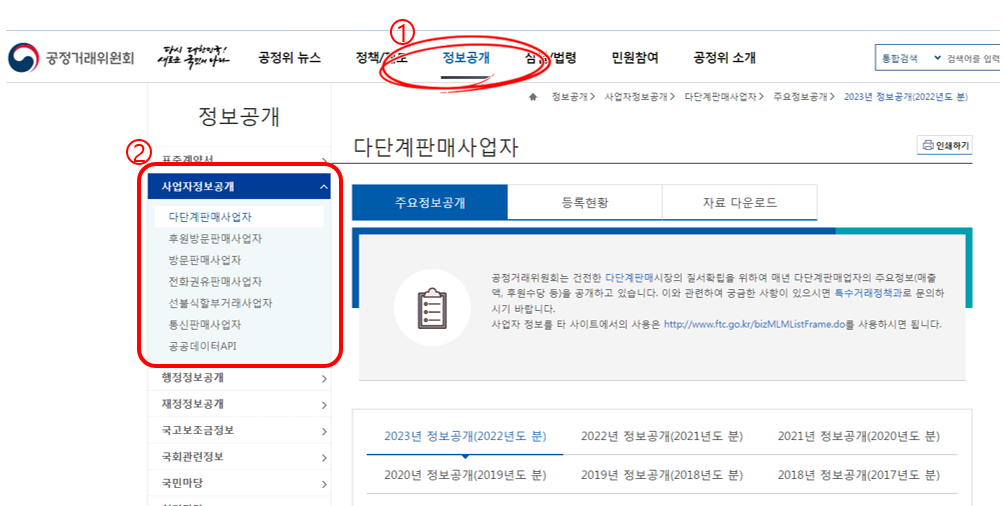 1. 공정거래위원회 홈페이지 접속 후 '정보 공개' 메뉴의 사업자 정보 공개 탭 조회
