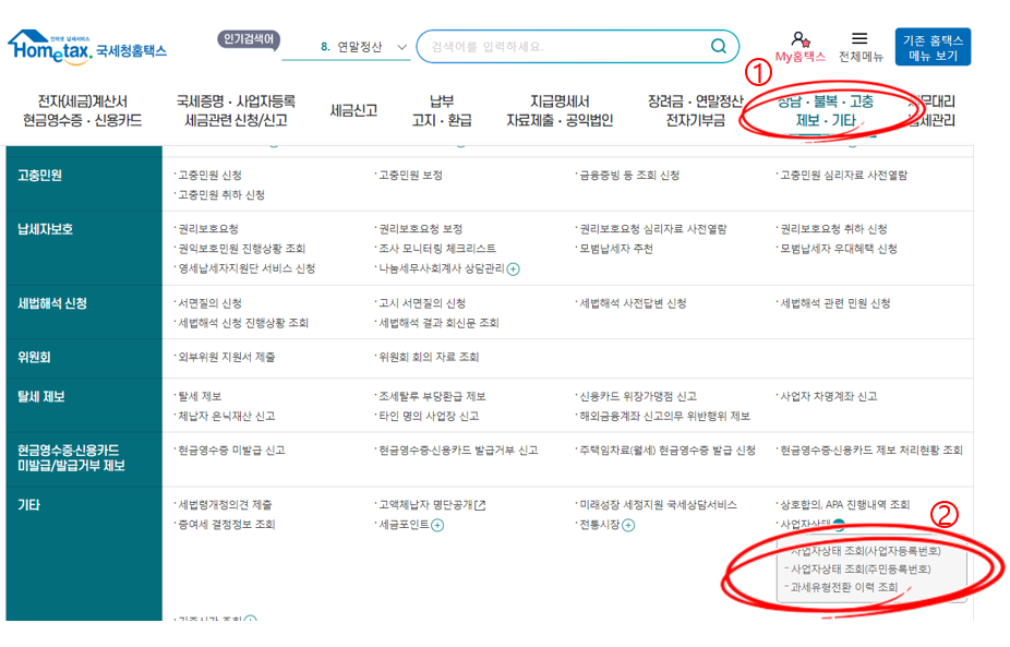 1. 국세청 홈택스 홈페이지 접속 후 '상담·불복·고충·제보·기타' 메뉴의 '사업자 상태 조회' 탭으로 조회