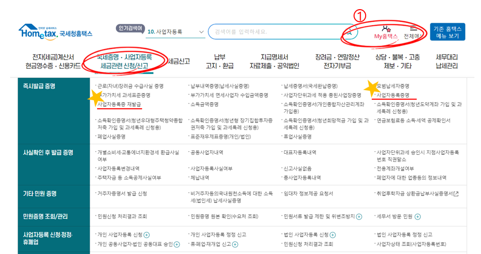 2. 국세증명,사업자등록 세금 관련 신청/ 신고 탭으로 가면 사업자등록증명번호와 사업자등록증 재발급을 쉽게 받으실 수 있습니다.