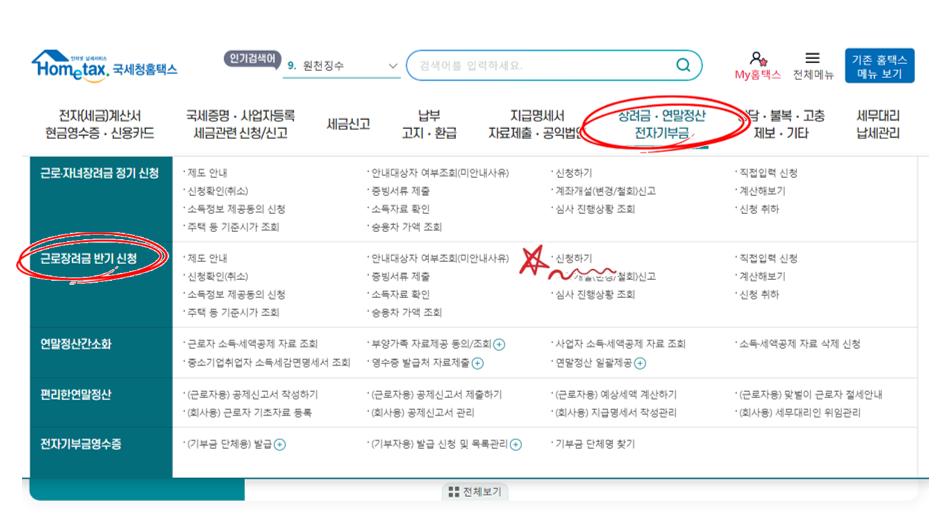 • 홈택스 홈페이지 또는 앱에서 신청 : [홈택스 접속] → [장려금·연말정산·기부금] → [근로장려금 반기] → [신청하기]