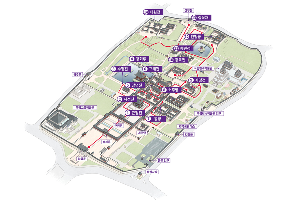 90분 코스: 홍례문 → 영제교 → 근정전 → 수정전 → 경회루 → 사정전 → 강녕전 → 교태전 → 자경전 → 향원정