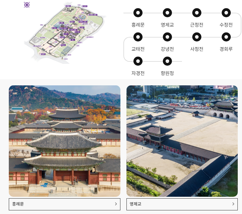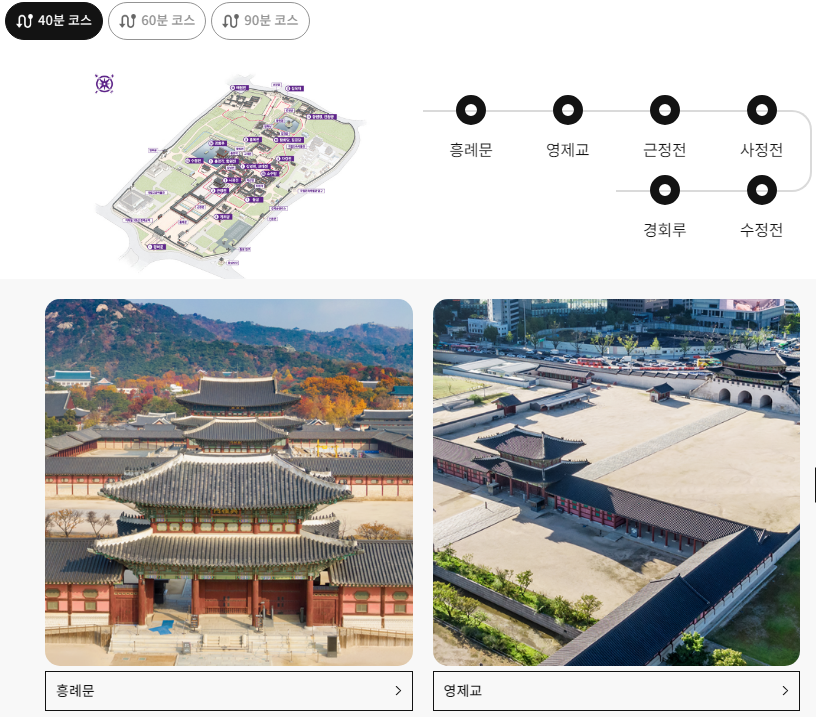 40분 코스: 홍례문 → 영제교 → 근정전 → 사정전 → 수정전 → 경회루