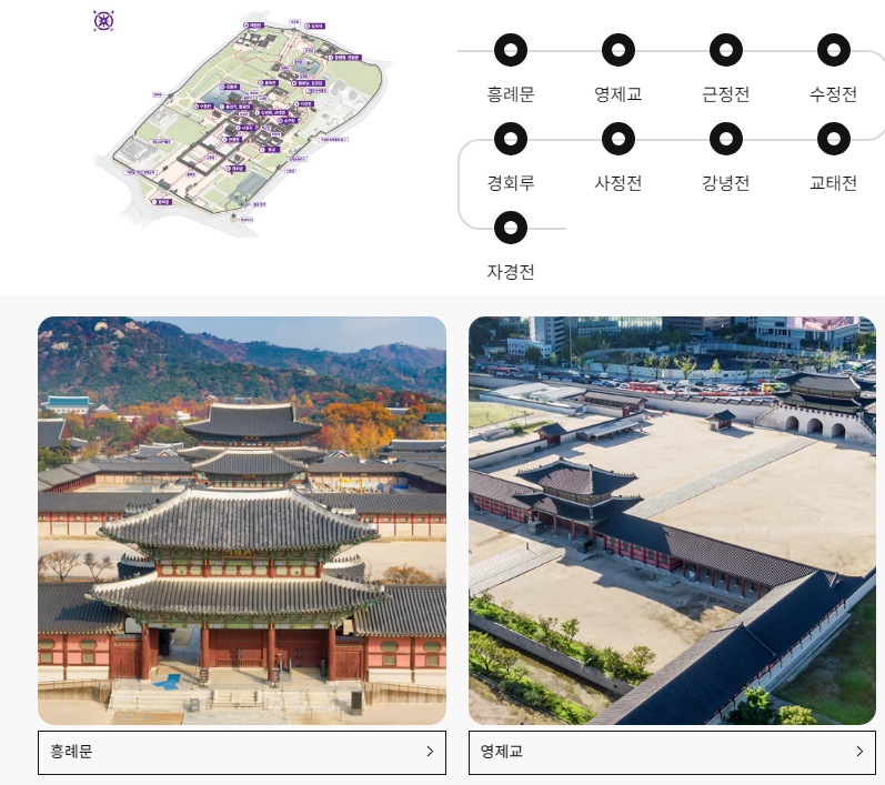 90분 코스: 홍례문 → 영제교 → 근정전 → 수정전 → 경회루 → 사정전 → 강녕전 → 교태전 → 자경전 → 향원정