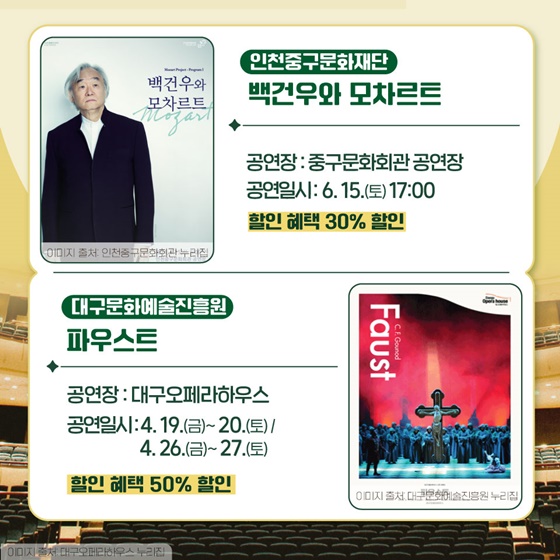 관람권 할인율은 공연마다 다르며 참여 기관과 공연에 대한 더 자세한 내용은 한국문화예술위원회 누리소통망(SNS)에서 확인하세요!