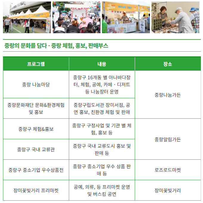 장소 : 축제장 중랑 알림 가든, 중랑 나눔 가든, 로즈로드마켓, 장미꽃빛거리