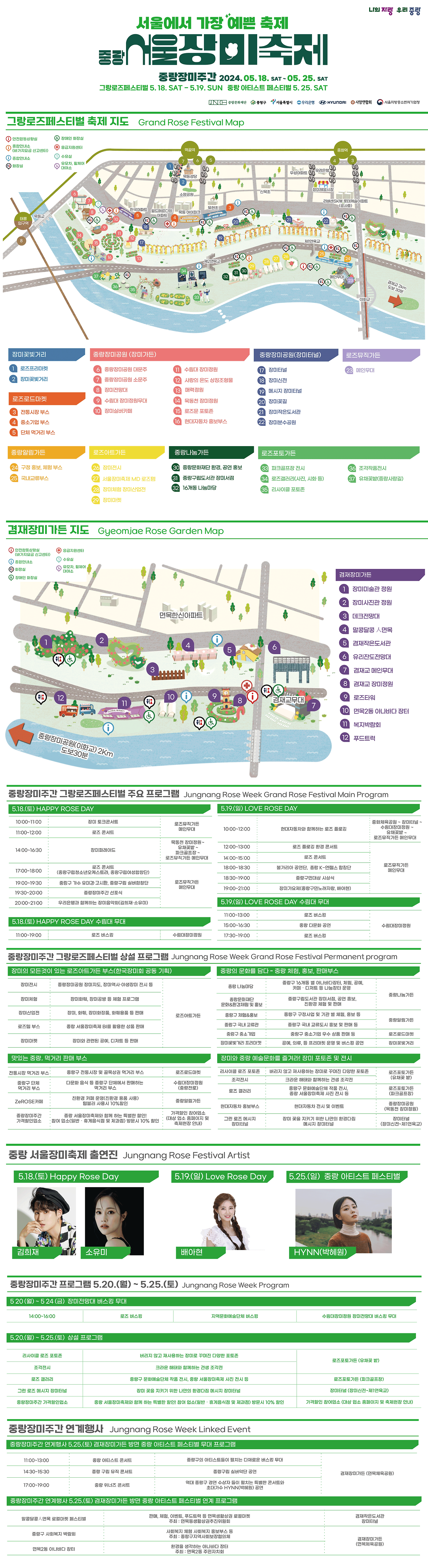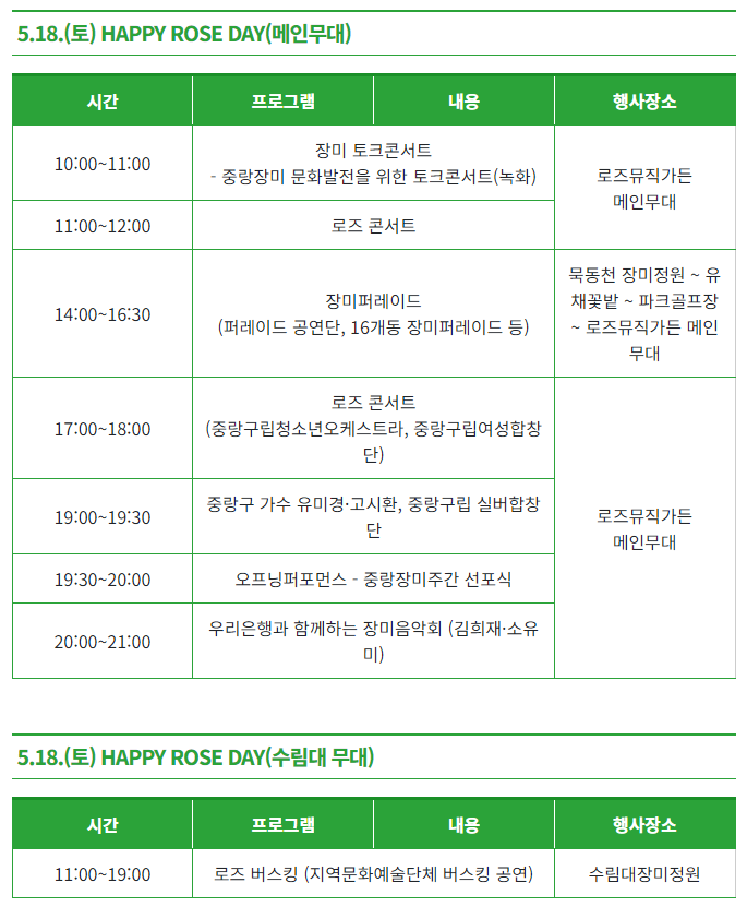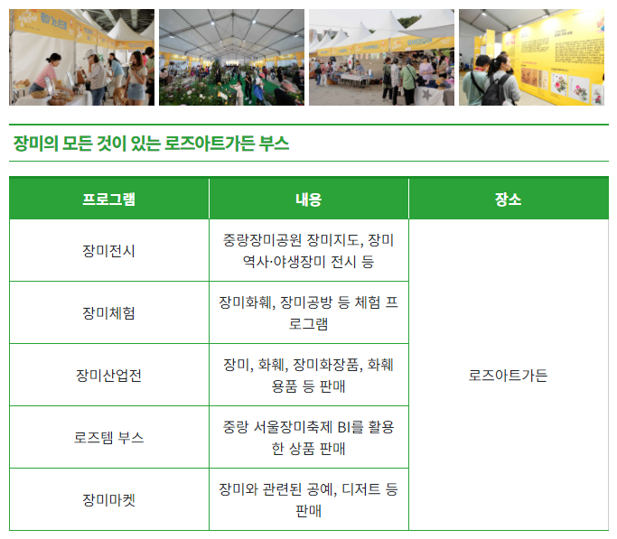 장소 : 축제장 중랑 알림 가든, 중랑 나눔 가든, 로즈로드마켓, 장미꽃빛거리