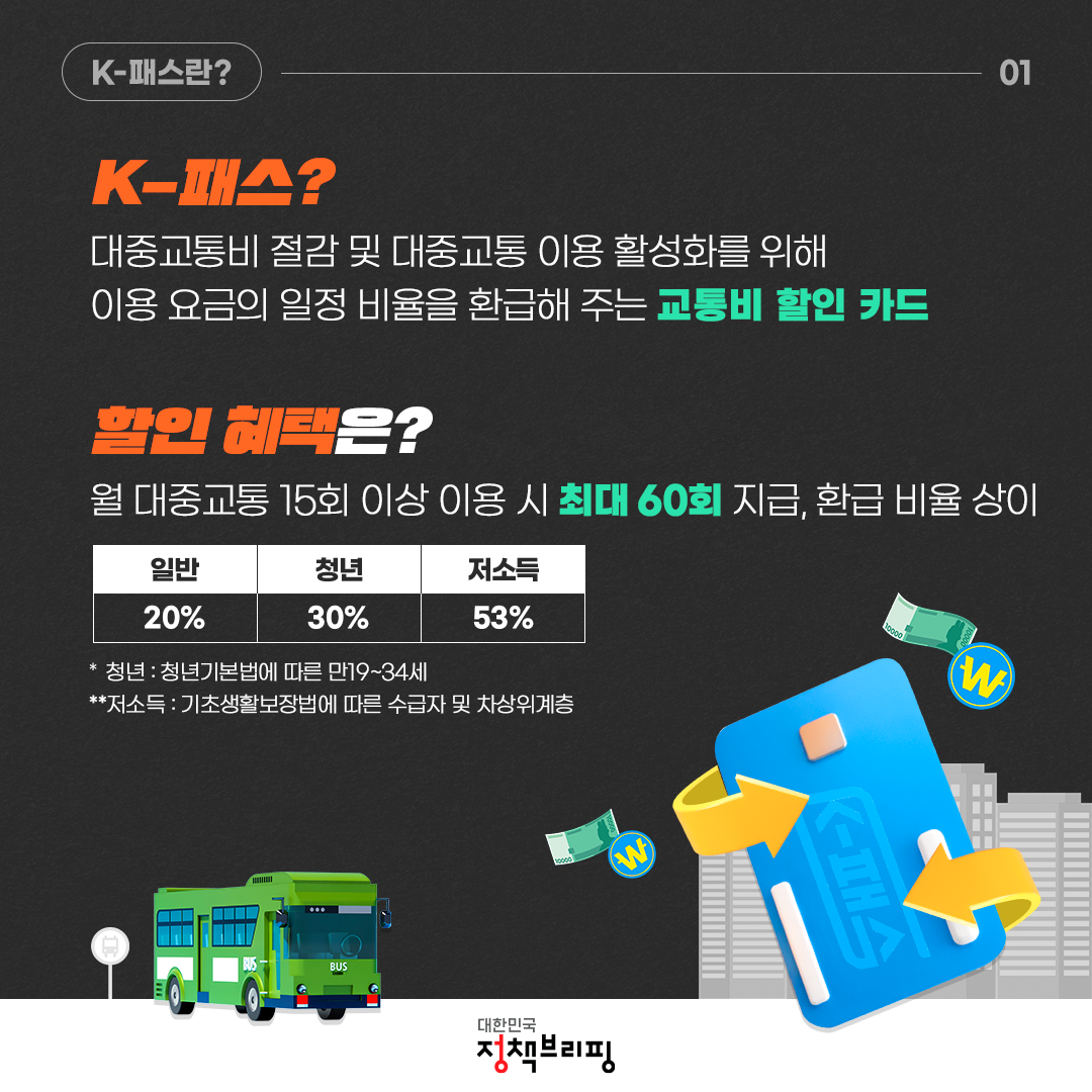 사용자가 대중교통을 이용할때마다 일정비율의 요금을 환급 받을 수 있는 교통할인카드입니다. 이 카드는 월간 이용횟수가 많은 사용자에게 더 큰 혜택을 제공합니다.