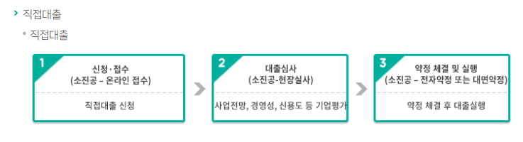 -신청 접수: 직접대출신청 클릭 → 원하는 자금 선택 → 대출금액 입력 → 다음 단계로 이동