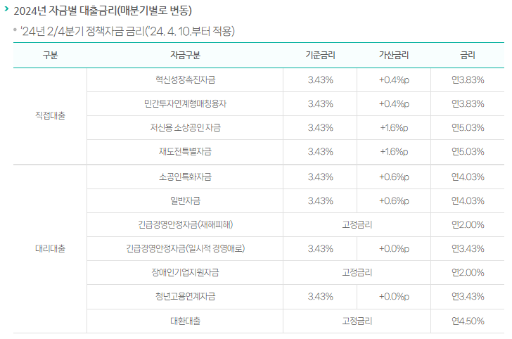 신청 자금별 금리 안내 (2024년 2/4분기부터 적용)