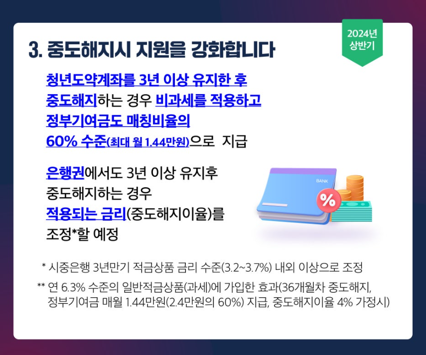 금융위원회는 청년도약계좌의 특별중도해지 사유로 혼인과 출산을 추가하였습니다. 또한 퇴직, 생애 최초 주택구입, 장기 치료가 필요한 질별, 천재지변 등의 사유로 중도해지하더라도 혜택이 보장됩니다. 3년이상 유지한 뒤 중도해지할 경우에도 상당한 혜택을 받을 수 있습니다.