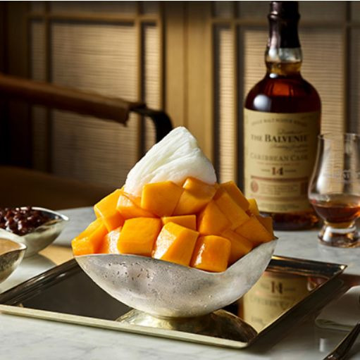 신라호텔은 호텔 망고빙수의 원조이죠. 올해에는 빙수뿐만 아니라 발베니 14년과 페어링하는 위스키 세트로도 만나볼 수 있어요.