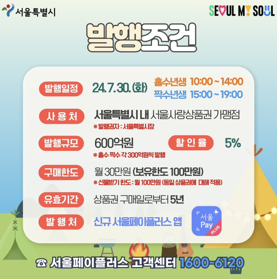 이번에는 5% 할인된 가격으로 상품권이 풀려요. 서울페이플러스 앱을 통해 인당 최대 월 30만 원까지 구매할 수 있어요.