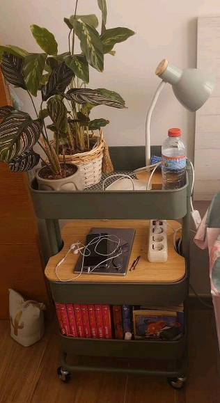 책장을 따로 두지 않아도, 거실 테이블에서 트롤리로 학습 도구를 정리하면 좋아요.